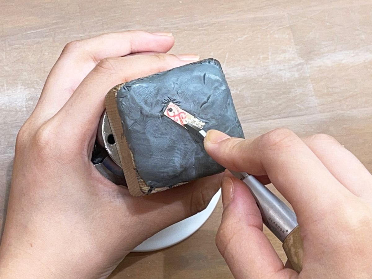 彫るアイテムを固定し、さまざまな角度から彫りやすくする「ブロック」と、刃先が尖ったデザインを掘るための道具「タガネ」を使います。