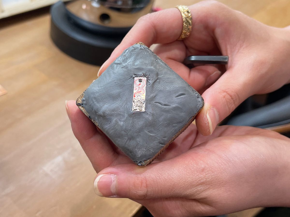 タガネは先が尖っているので、持ち方などもしっかりレクチャーしてもらいます。刃先の下の角を使い、ドット、ウィックルとよばれる彫りを入れるのですが、ドアノブを回すように手首をひねりながら彫り進めるのがコツだそう。