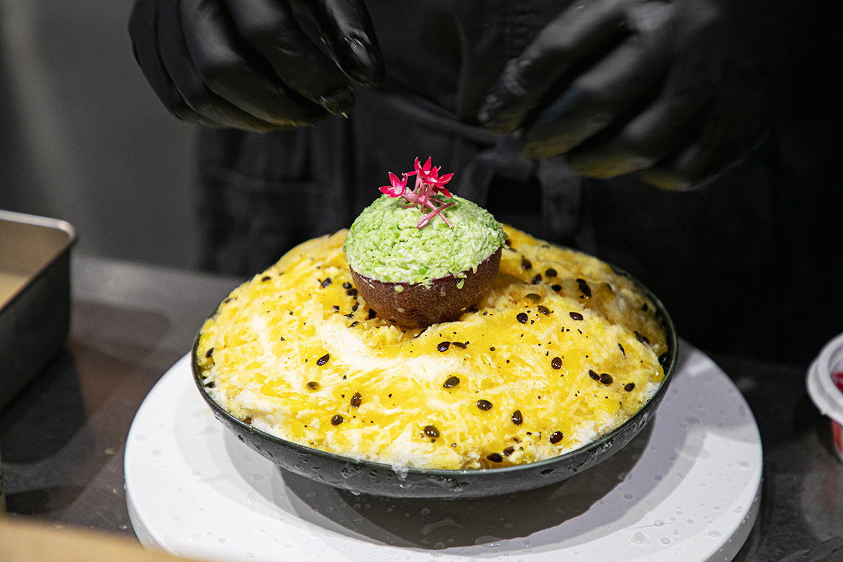 カウンター席からは、氷が削られかき氷が作られる工程を見ることができます。どんどん作られるさまを見るのもとても楽しいですよ。ほんのり甘さのある「アングレーズソース」と「パッションフルーツソース」がふんだんにかけられ、その上に「塩麹クリーム」がのせられます。酸味が強く香り高いパッションフルーツには、塩麹の甘じょっぱい風味が合うそうです。