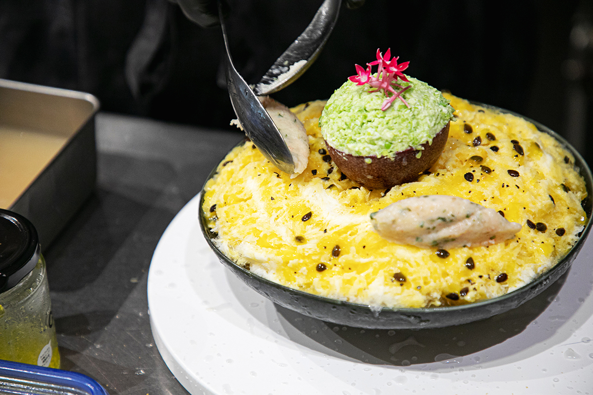 こちらは、「パッシュンフルーツ、甘海老なめろうタルタル、枝豆、出汁醤油のかき氷」。連なる食材名を見るだけでも、本当にかき氷!?と、味の想像がつきません。食材の珍しさはもちろん、見た目の美しさにも注目です。さすがフレンチのシェフが手がけているだけあって、まるでアート作品のよう! こちらのメニューに入っている食材は14種類。食材のひとつひとつが、丁寧に下ごしらえされています。食材数はメニューによっても変わりますが、多いときでは30種類ほどになることもあるとか。