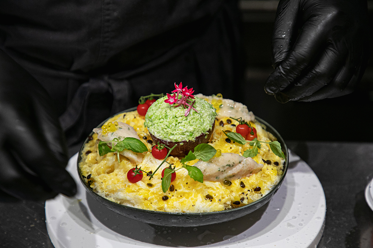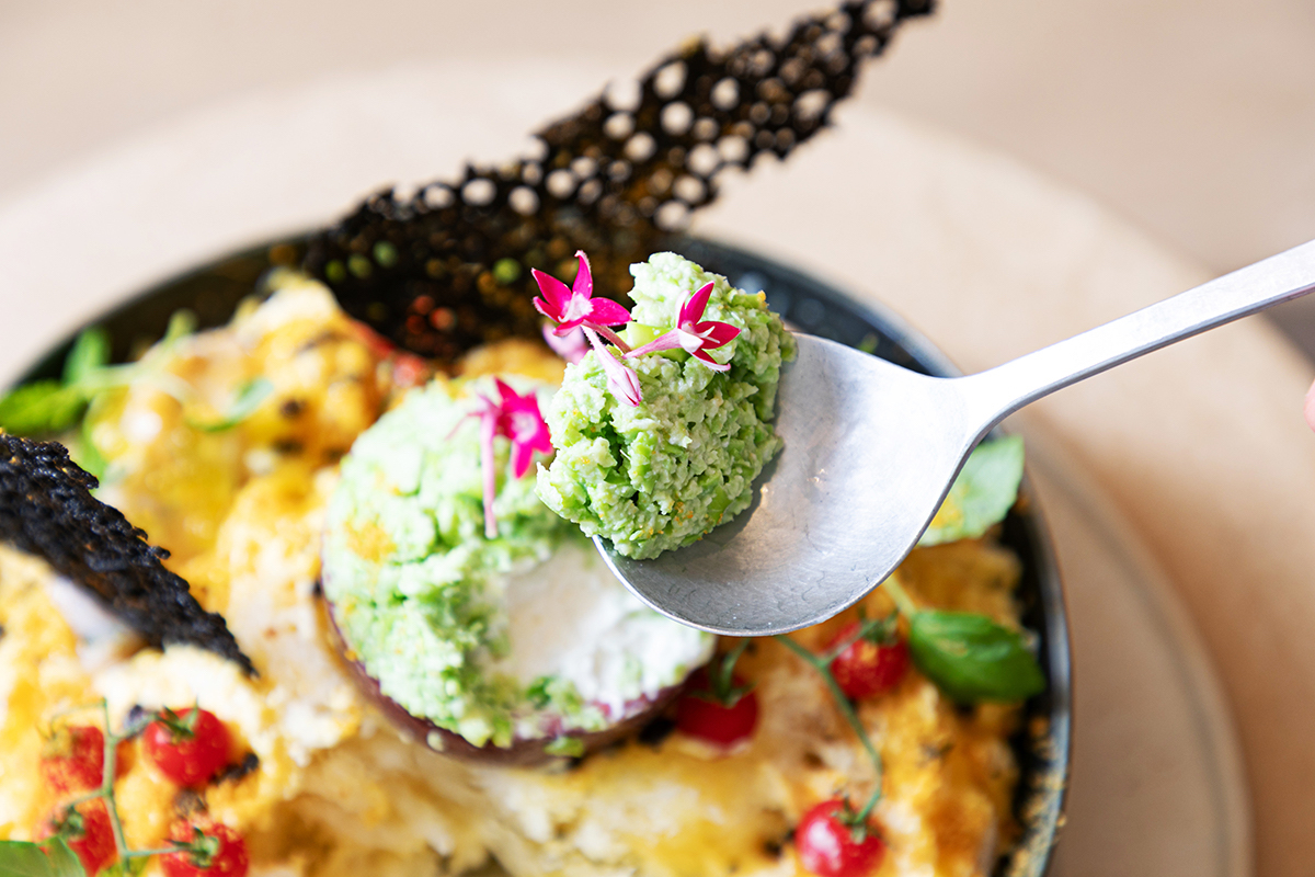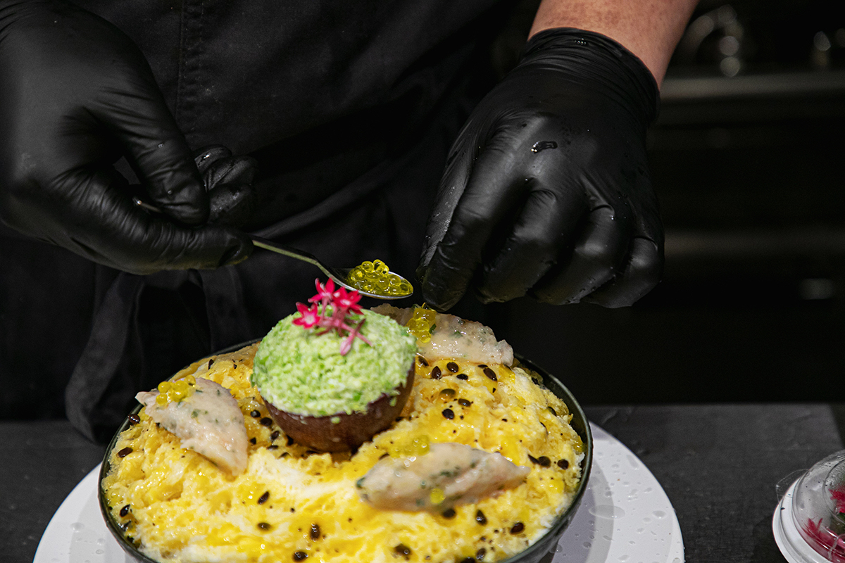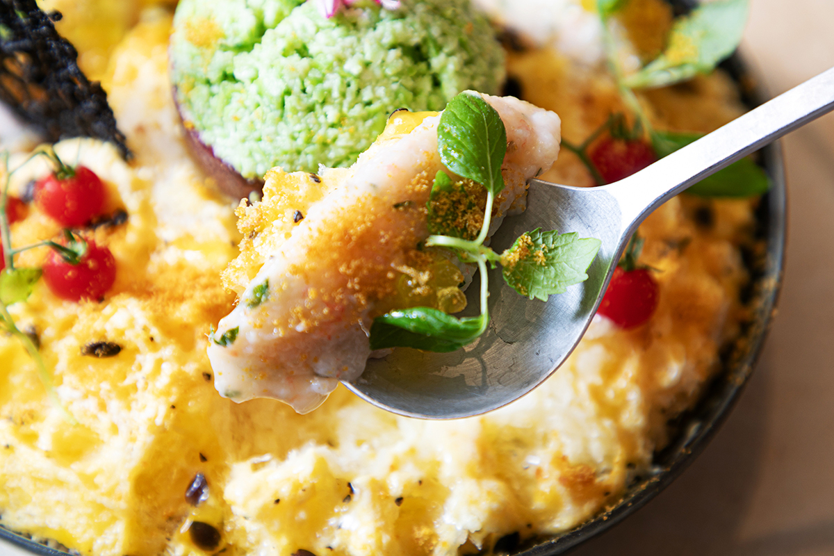 中央のものはアボカド!? と思いきや、違いました。こちらはパッションフルーツの果肉を取り出したものを容器代わりにして、ミョウガのみじん切りである「茗荷シズレ」をベースに、塩麹とずんだをからめてつぶした「塩枝豆ずんだ」を詰めたもの。上にのった鮮やかな花は「ペンタス」。思わず写真を撮りたくなるような、美しい見た目にこだわっているそうです。