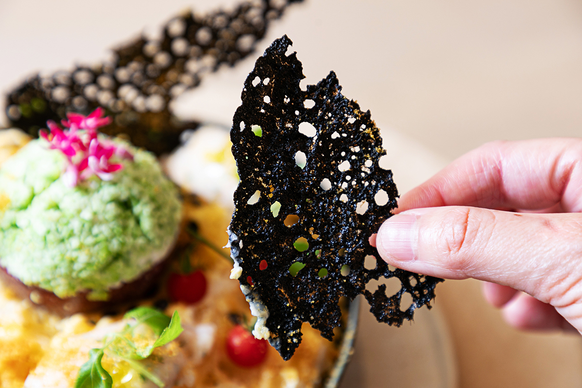まるでアートのような黒いものは、「イカ墨チュイル」。お店のフライパンで手作りされていて、ほんのり感じる苦みとサクサク食感が、かき氷の甘みに飽きたころにちょうどよく口の中をリセットしてくれますよ。