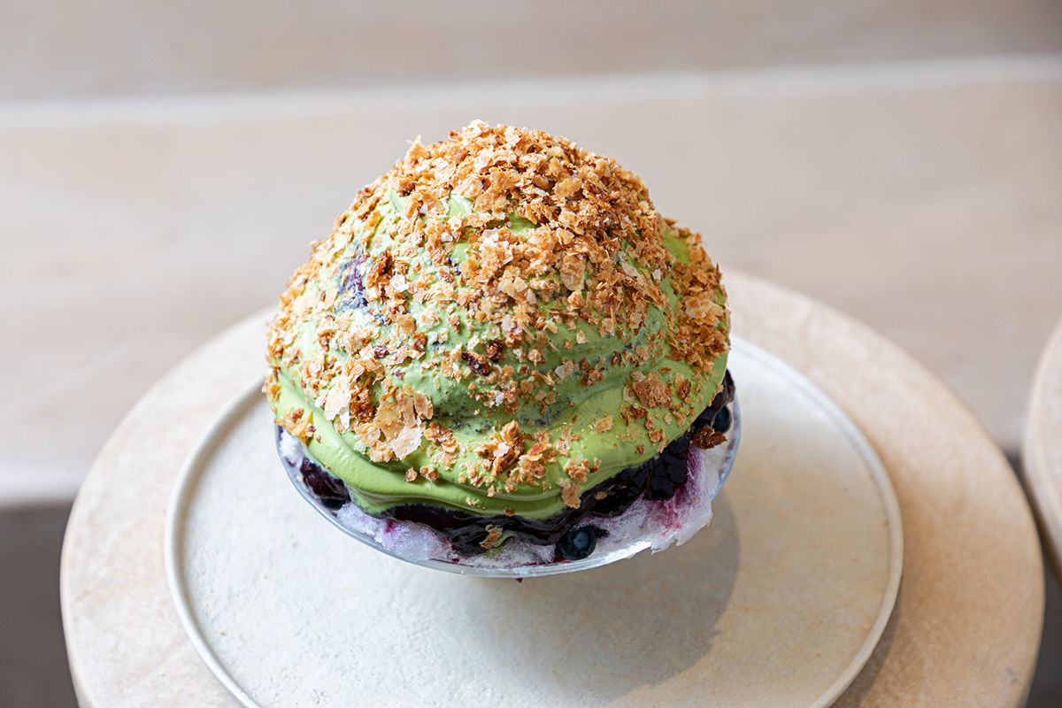 スイーツ要素の強いかき氷のメニューも、もちろんあります。こちらは「ブルーベリー、宇治抹茶、熟成黒みりん、蕨餅のかき氷」。