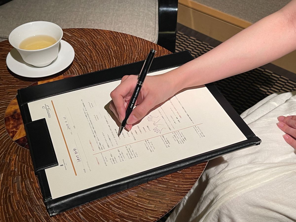 受付を済ませたら、カモミールティーをいただきながらカウンセリングシートに記入。病気の有無や定期的にケアを行っているか、ネイルポリッシュを使用しているかなどの設問に答えます。