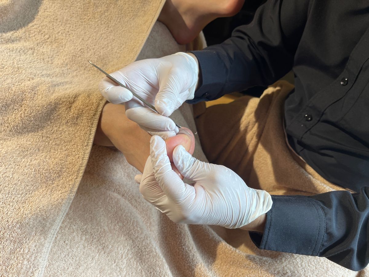 親指の横にあるタコを処理してもらったのですが、驚くほど痛みは感じませんでした。医療用の手術などとは違って、痛みが生じないよう工夫を施しているのだそう。