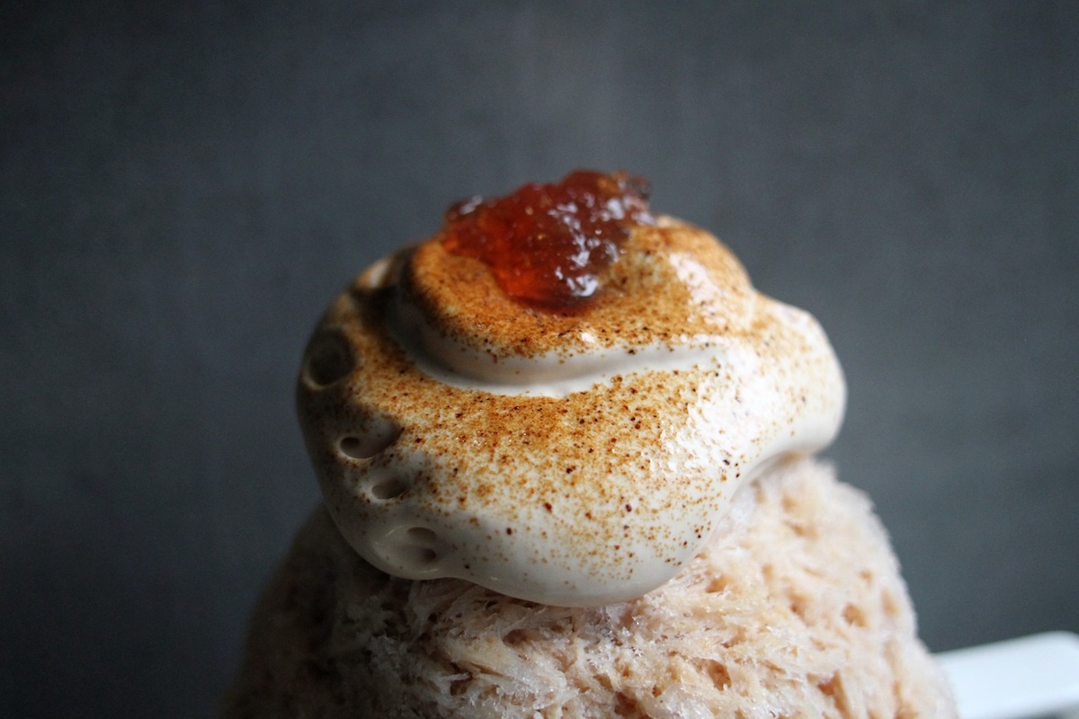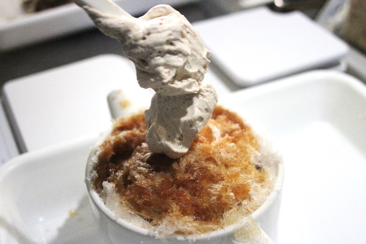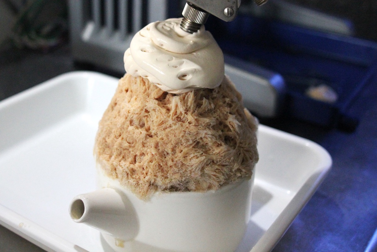 氷で紅茶クリームやクルミをすっぽりと覆い形を整えたら、紅茶ミルクシロップをオン!中のシロップと、外側のシロップとで異なるシロップを使用し、味の変化が楽しめるようになっています。