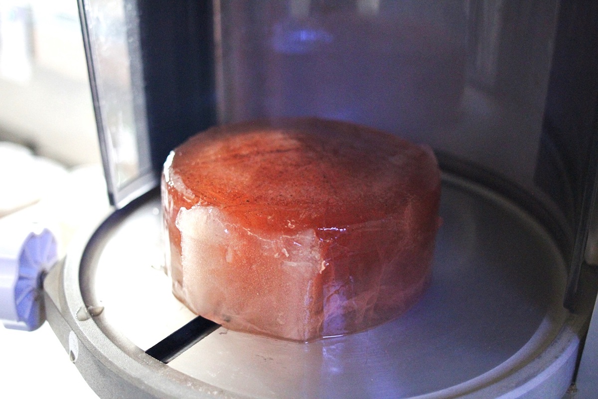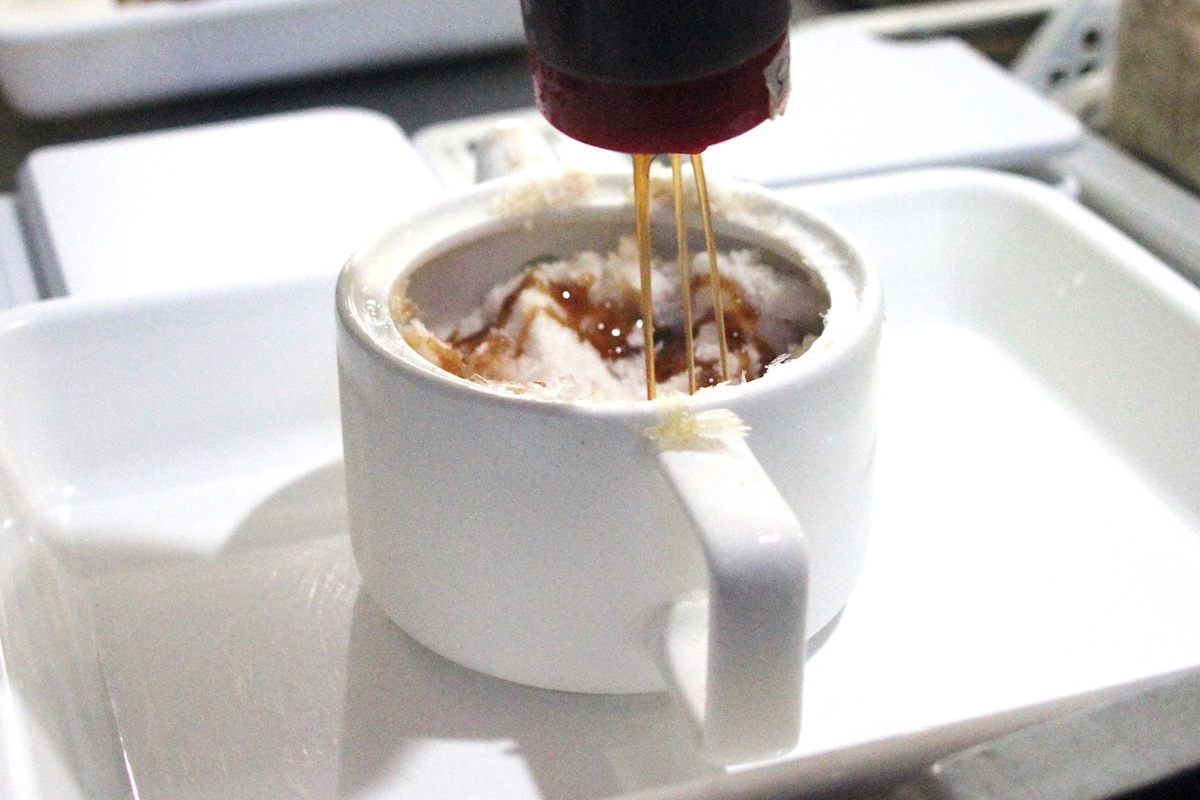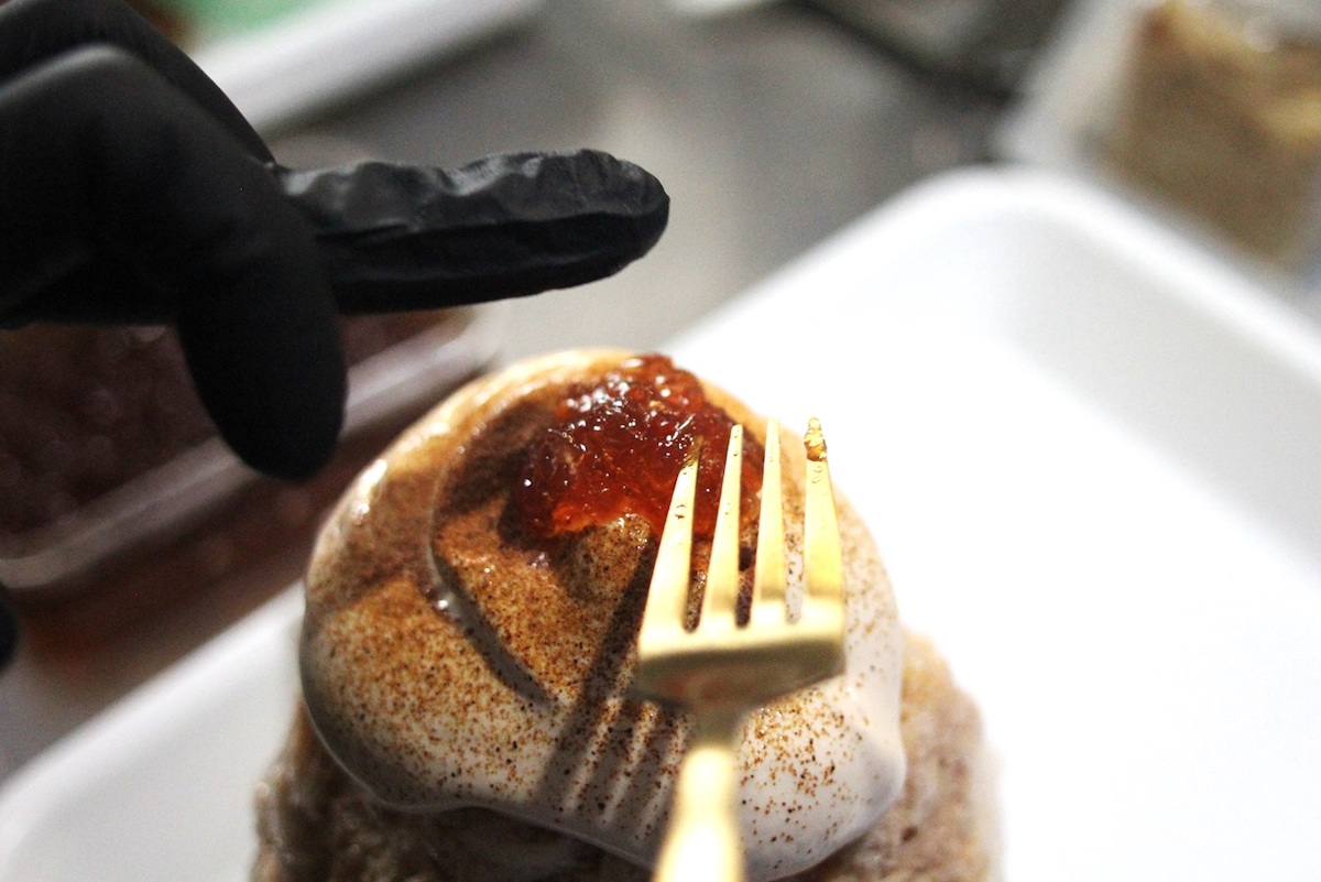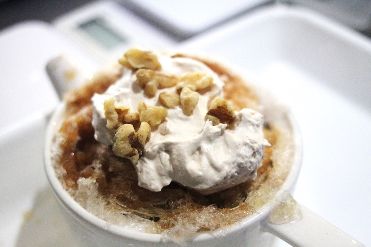 氷で紅茶クリームやクルミをすっぽりと覆い形を整えたら、紅茶ミルクシロップをオン!中のシロップと、外側のシロップとで異なるシロップを使用し、味の変化が楽しめるようになっています。