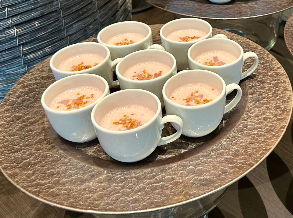 「桃のひとくちスープ~ラッシー風~」は桃のスープをヨーグルトとともにひとくちサイズで味わえます。桃の上品な甘さとヨーグルトの程よい酸味がかけ合わさっておいしい!