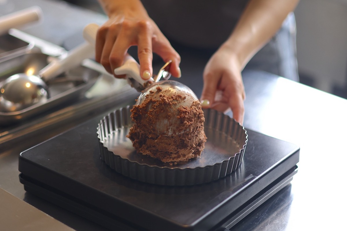 まずはチョコレートムースケーキやレモンチーズケーキなど、4種類のなかから好みのものを選び、希望するグラム数があてはまる番号(例:①100〜120g)を店頭で伝えると、器に盛り付けてくれます。
