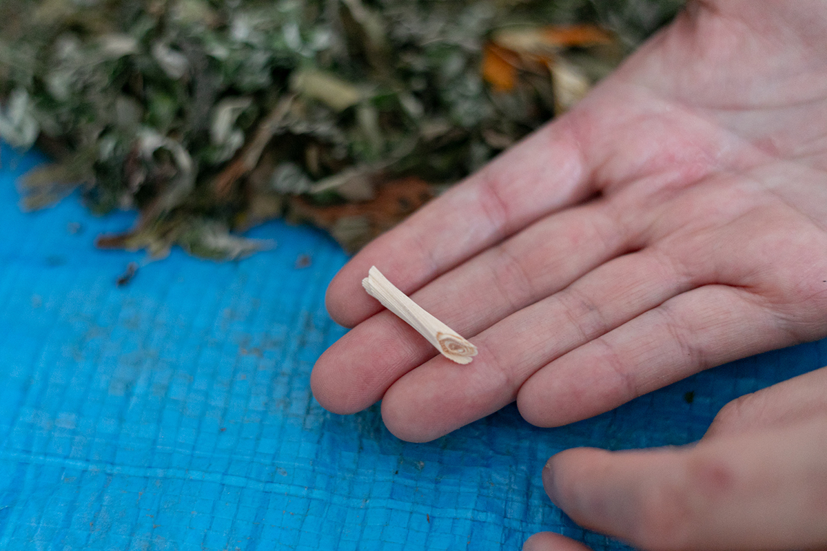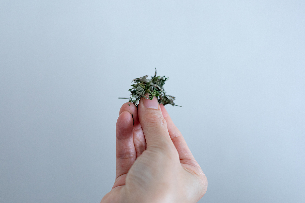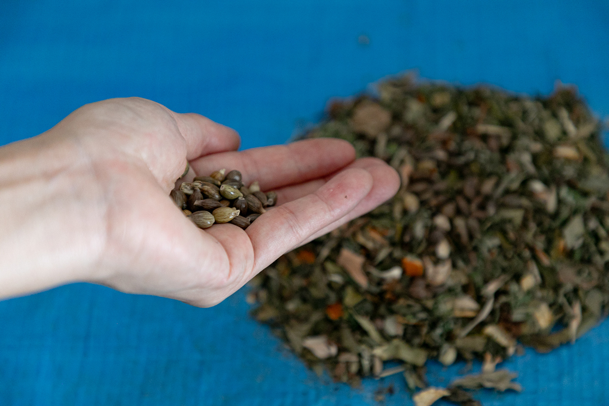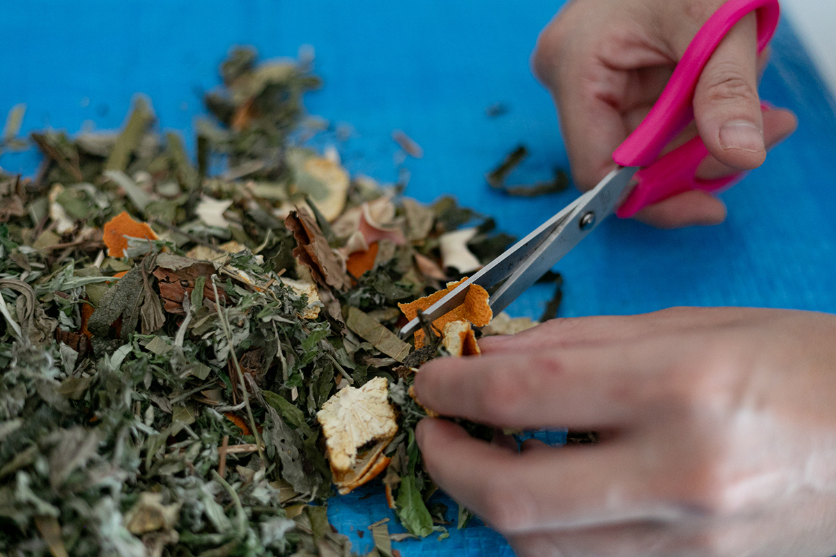 ドクダミなど枝があるものは布から出てきてしまい肌に当たると痛いので、ハサミなどで細かく切ります。無心に細かくしていく作業が楽しくて、つい夢中になってしまいます。ハーブが触れ合うかさかさという音や、ほのかに香る香りで、リラックス効果抜群。15分ほど集中して切っていくうちに、こんなに細かくなりました!