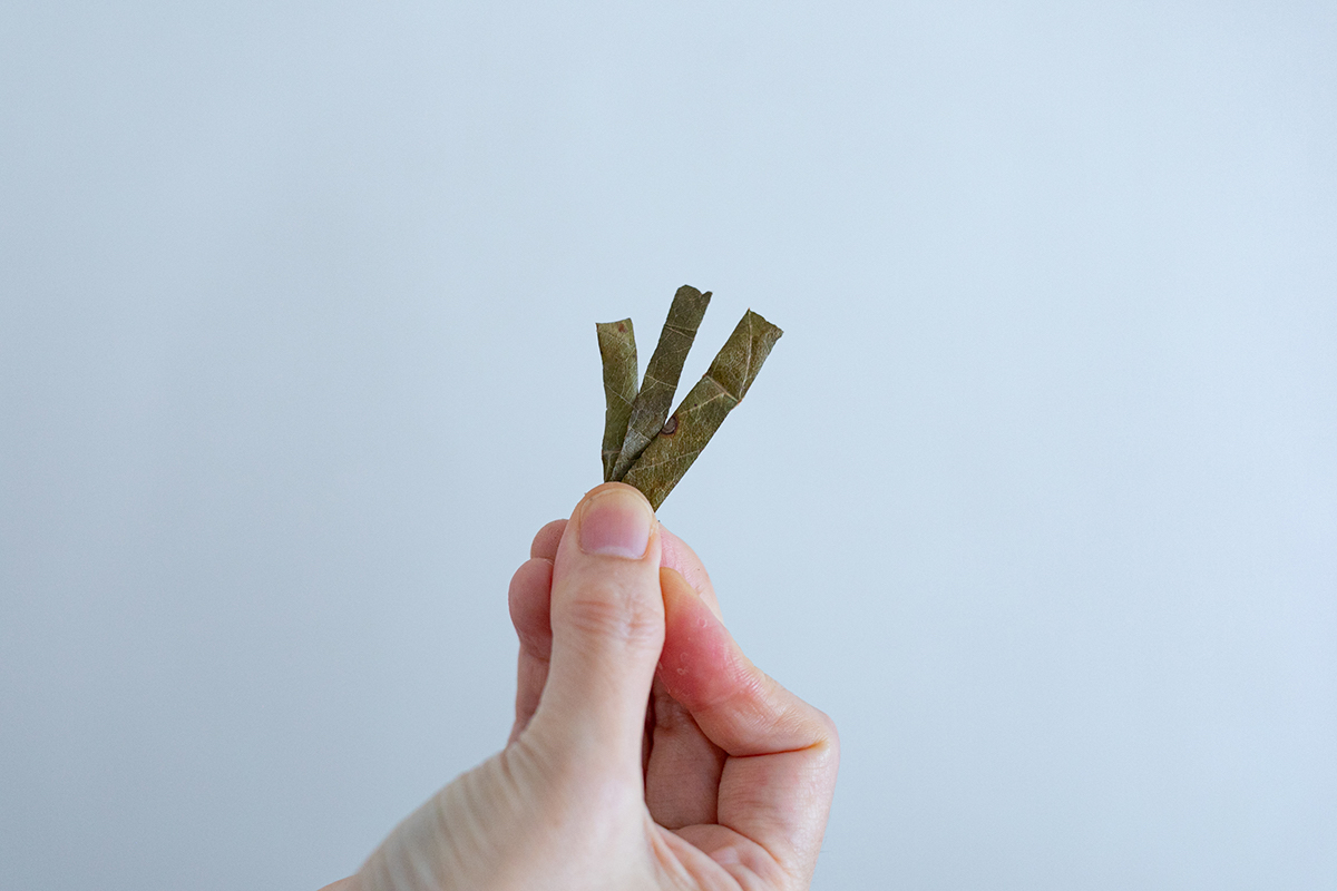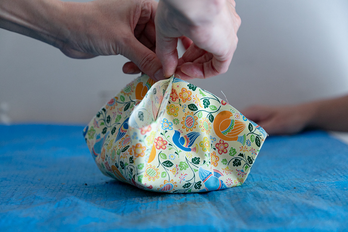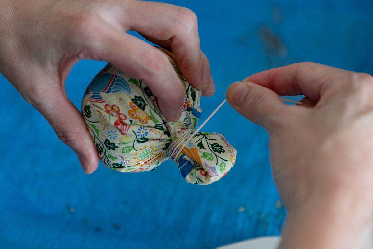 タコ糸をしばるときのポイントは、根元を持ちつつ、ねじらないこと。根元がねじれると中のハーブが出てきやすくなってしまうそうです。てるてる坊主を作るように丸くして、くるくるとタコ系でしばります。メンテナンスのときにほどくため、結ぶ際は固結びではなくほどきやすい蝶結びにします。