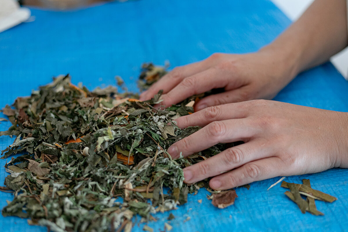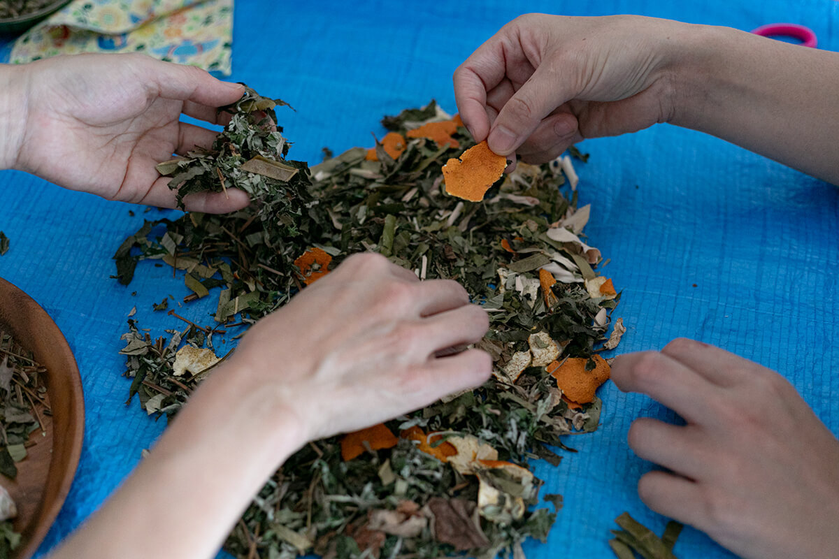 ハーブの説明をひと通り受けたら、布に入れてボール状にするために、並べられたハーブを手でもんで、細かくしていきます。