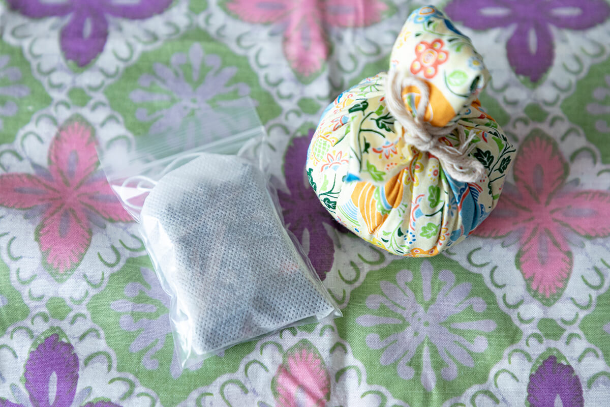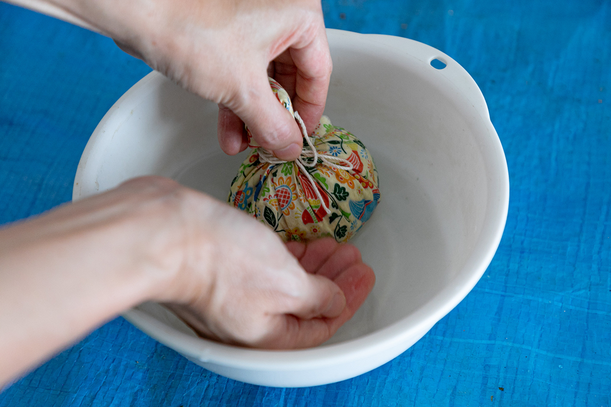 用意された布にハーブを包んでいきます。布で4つ端をつかみ、てっぺんを持ちながら包みこみます。ハーブが横から出てこないように、きれいにまとめて。