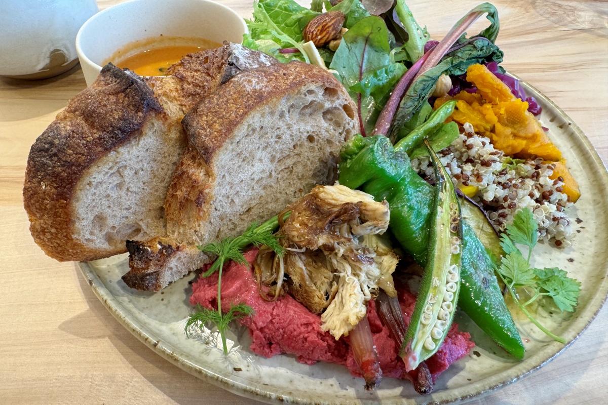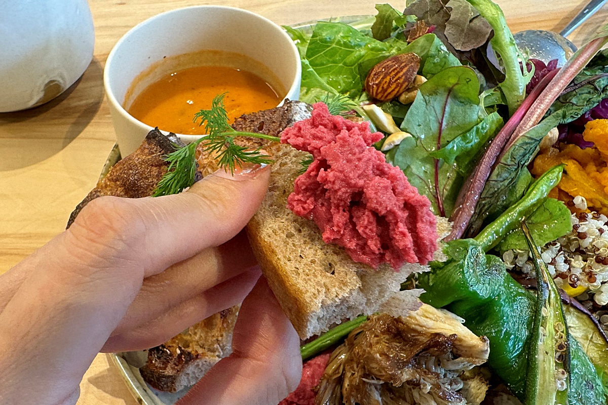 プレートからあふれんばかりに盛り付けられているのは、自家製カンパーニュや、フレッシュなサラダ、オーガニック野菜のグリル、ビーツのフムスなど色とりどりの野菜メニュー。