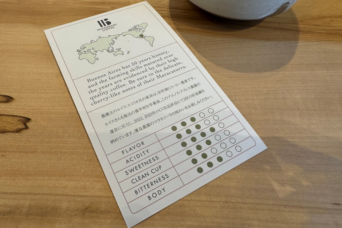 コーヒーに添えられたカードには、産地や味わいの特徴だけでなく、農園についても詳しく説明が書かれています。