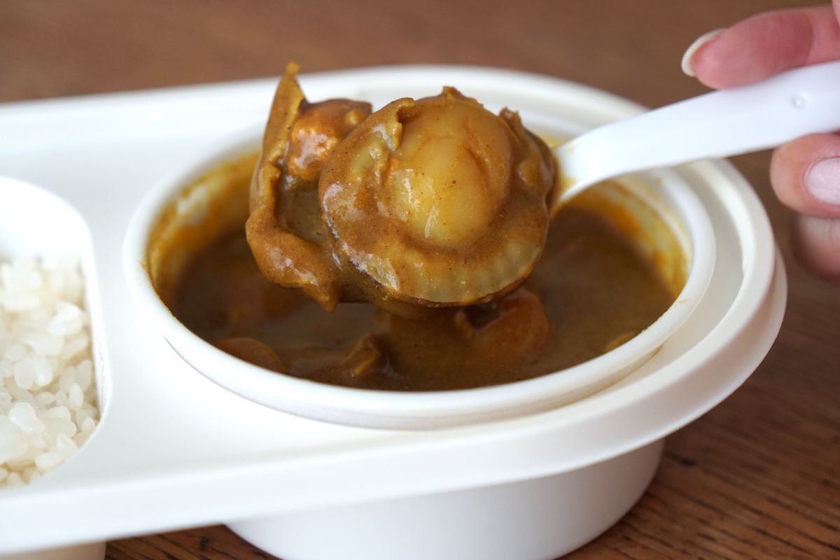 スプーンからはみ出すほどの大粒のホタテ! ギュッと引き締まった身は食感も楽しく、噛むたびに甘みとうま味が口の中にじんわりと広がります。
