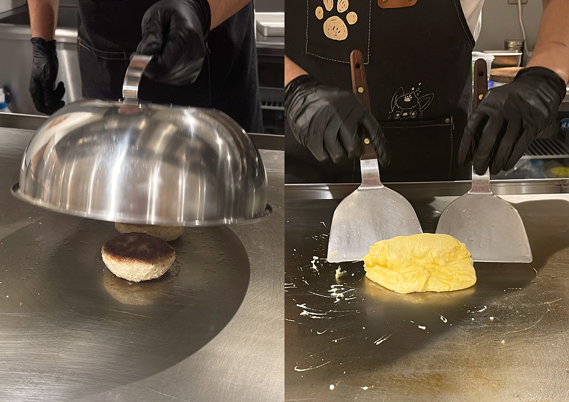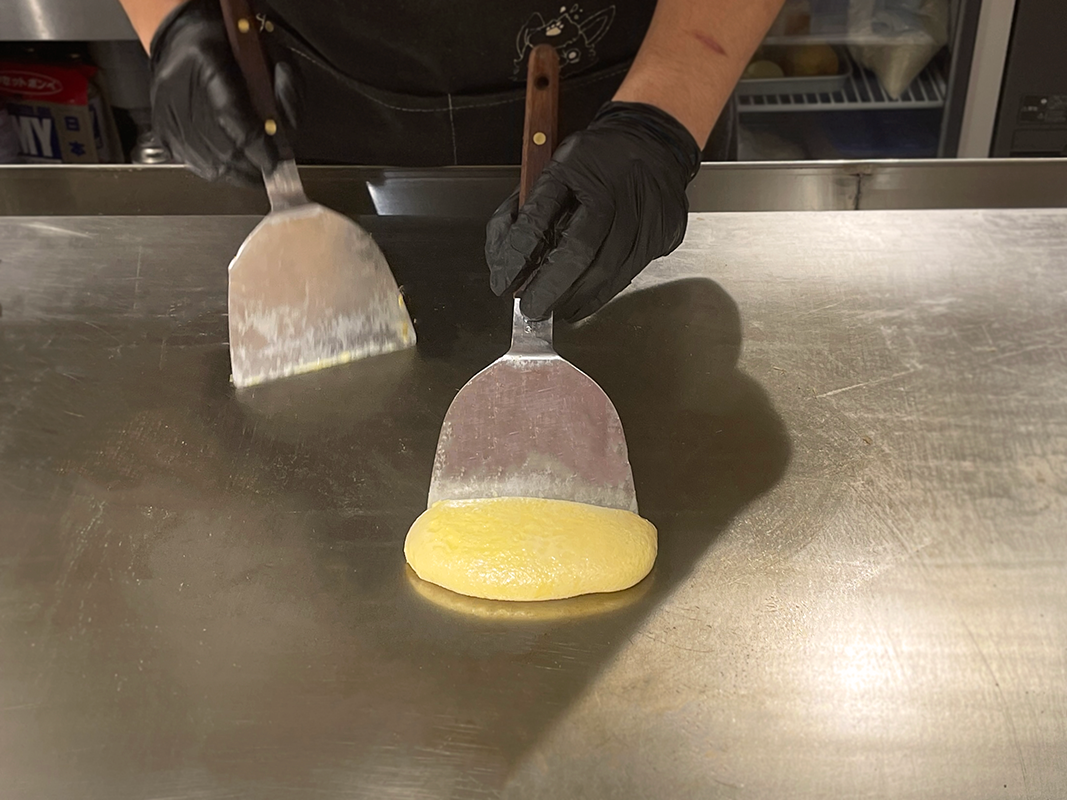 熱々の鉄板ですぐに卵が焼けてしまうので、ふわとろに仕上がるよう30秒以内で仕上げるのがポイント。