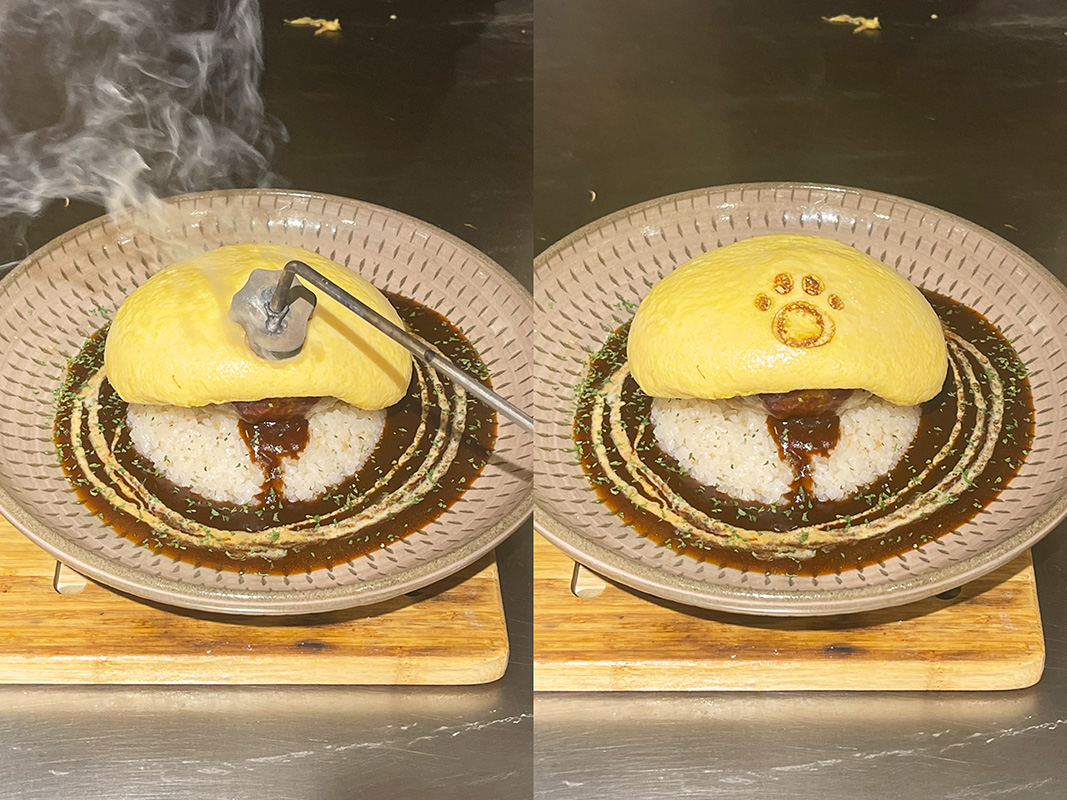 ハンバーグやオムレツ、ソースをきれいに盛り付けたら、最後に肉球の焼印を押して完成です。