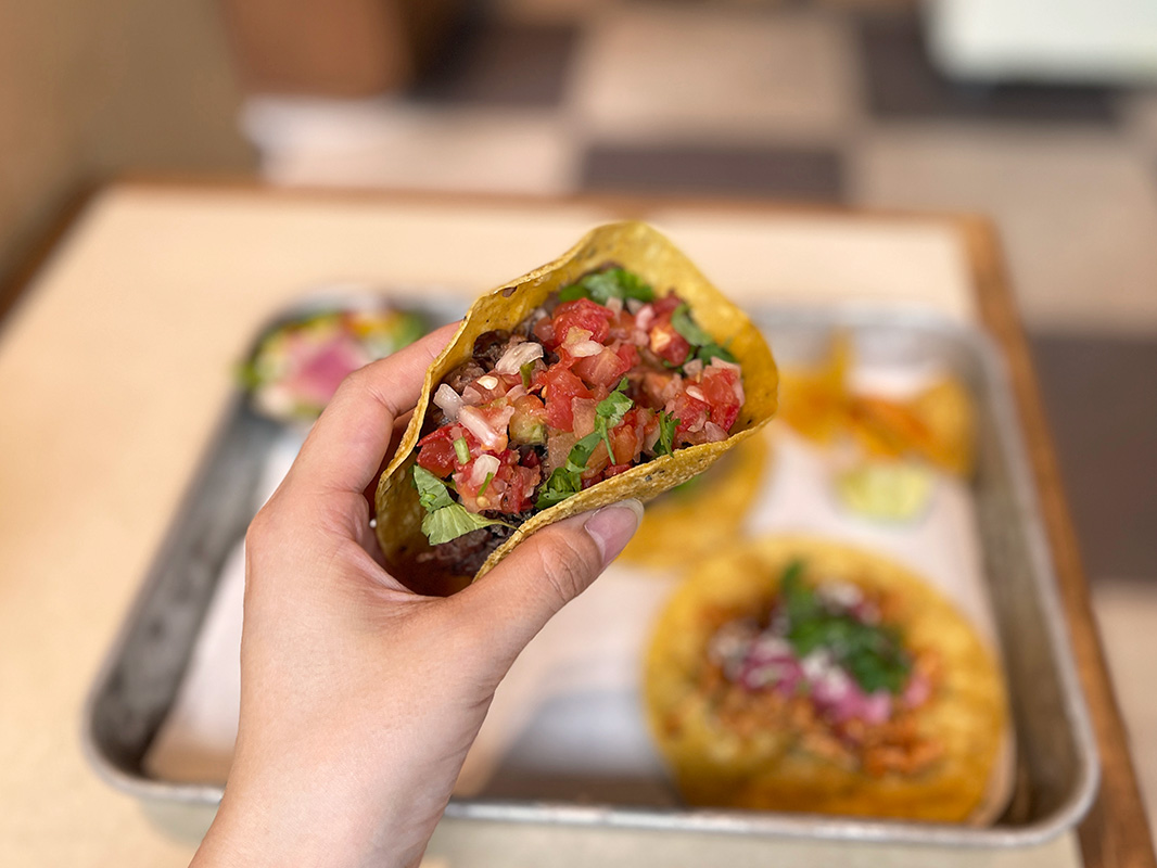 軟らかくて香ばしいトルティーヤとうま味たっぷりの牛肉、酸味がありピリ辛なピコ・デ・ガヨのすべての相性が抜群!