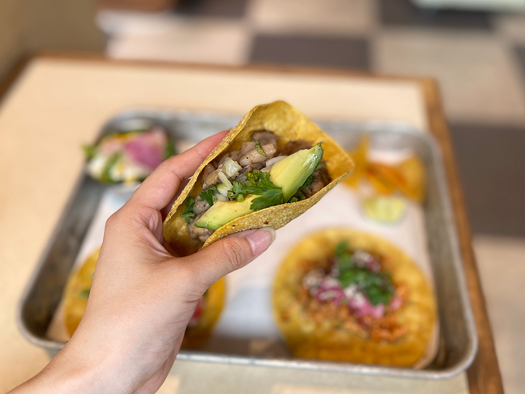 タコスは、具材をトルティーヤでしっかりと包み込み、素手で口へ運ぶのが流儀。