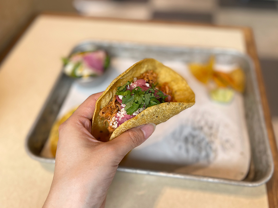 ほんのり酸味のあるカッテージチーズ、パクチーやタマネギとの相性もよく、あっさりとしているので食べやすいタコスです。