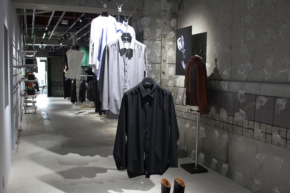 店内は、京都らしい和の趣たっぷりな外観とはまた雰囲気が異なるスタイリッシュな空間です。こちらは、「ノーノーイエス」で販売している商品が並ぶアパレルスペース。ジャケットや足袋、財布などのレザーアイテム、特殊2層染めを行ったTシャツなどがずらりと並んでいます。