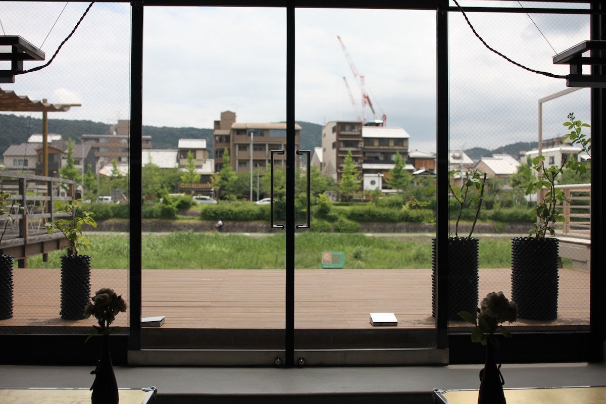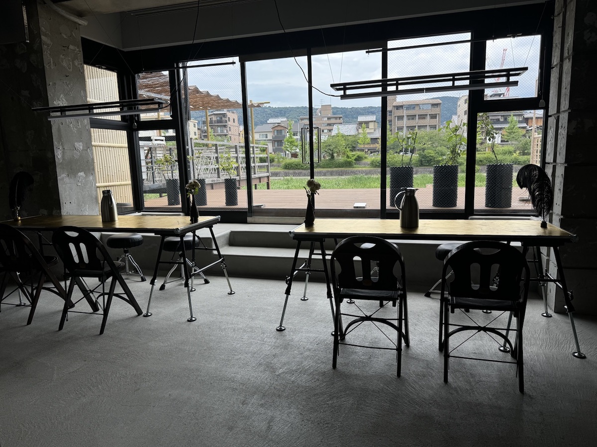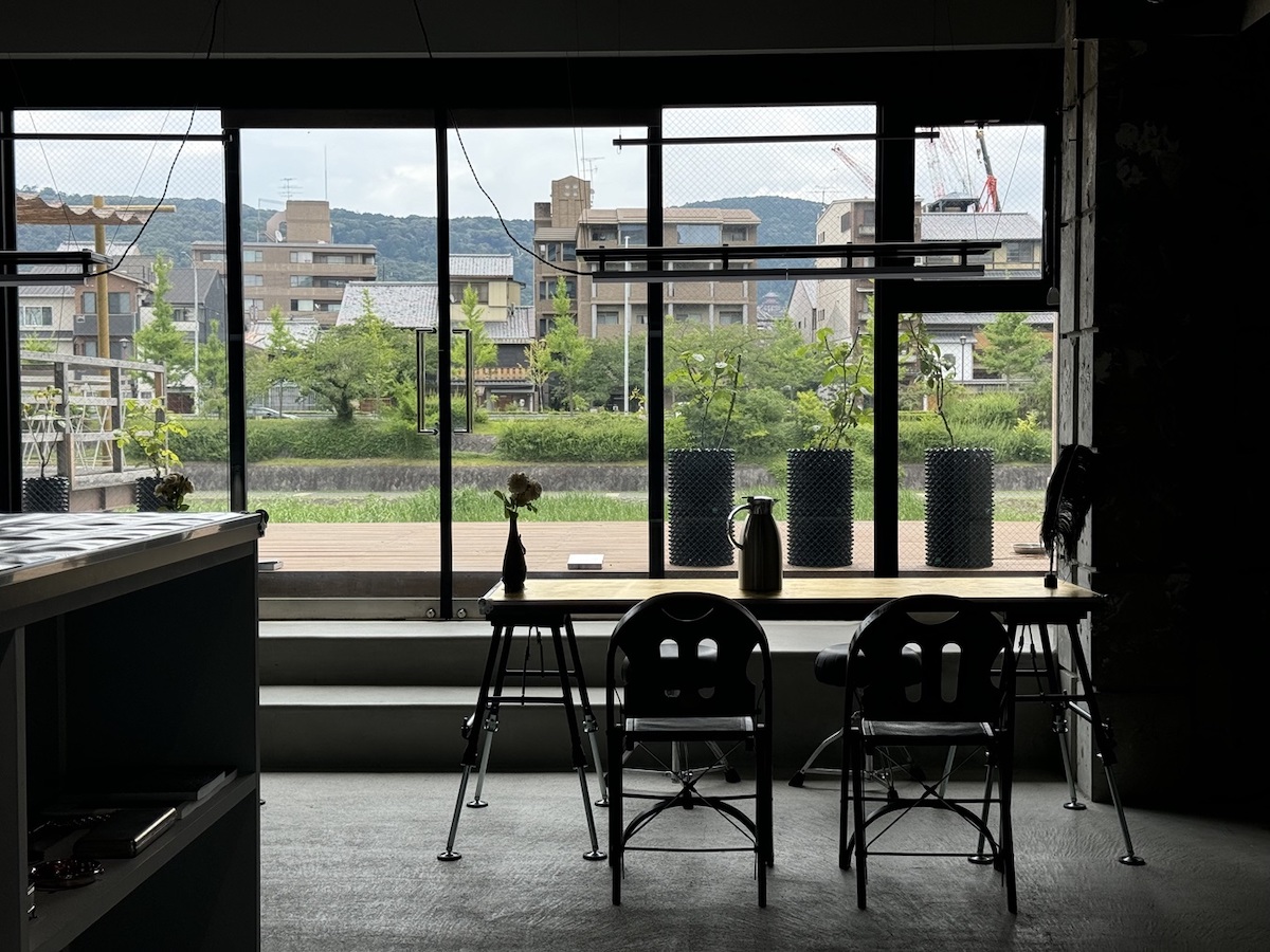 かき氷専門店「京冰菓 あてなるもの」があります! 一番奥には開けた景色。改めて鴨川沿いだと実感するのと同時に、隠れ家のようなオシャレなかき氷専門店があるとはビックリ。