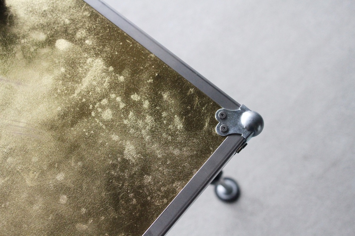 テーブルの天板は黄金色のレザーです。「平安時代の風情を感じてもらいたい」との思いから、金箔をレザーに貼り付け自作したというこだわりの品。使えば使うほど味が出るテーブルは、レザーアパレルならではのインテリアですね。