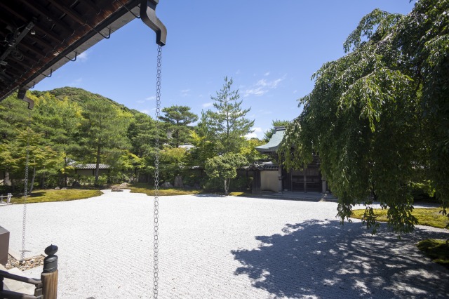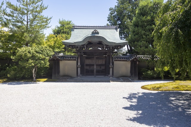 方丈から望む庭園は「波心庭(はしんてい)」とよばれ、白砂の波模様が見事な枯山水庭園です。正面には天皇の使いのみが通ることのできる勅使門がそびえ、白砂の下には石畳の道が隠れているのだそう。毎年1月1~7日だけ特別にこの門を開け、一般の参拝者がお詣りできるというから、この期間に訪れてみたいですね。