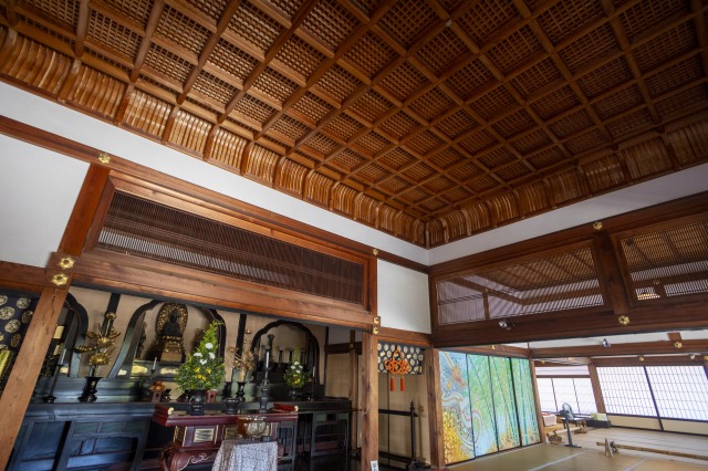 四角い方丈を取り囲むように4つの建物があるのは、火事や有事の際に本尊を護るため。方丈の天井は格式高い部屋に用いられる「折上小組格天井(おりあげこぐみごうてんじょう)」という造りで、格子に組んだ角材の上に板を張った二重天井です。さらに、一つの格縁の中に細い組子を編むという非常に凝った建築様式で、さらに豪華な折上天井は二条城の大政奉還の間がある二の丸御殿でも見られます。