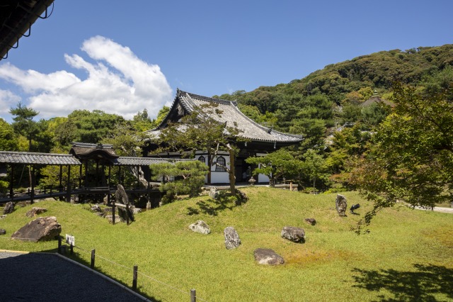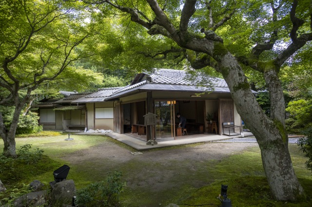 入口すぐの場所から望む大文字や、丸窓が美しい茶室「遺芳庵」