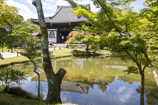 伝・小堀遠州(こぼりえんしゅう)作「高台寺庭園(国指定・史跡名勝)」の「偃月池(えんげつち)」の上には楼船廊が架けられており、北に亀島、南の岬に鶴島の見事な石組を望むことができます。また開山堂を挟んで反対側には「臥龍池(がりょうち)」という大きな池が水を湛えています。