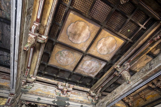 開山堂には歴史的に重要な構造物や寺宝が多数残っています。こちらの天井も折上小組格天井ですが、先ほどの方丈よりもさらに豪華で、黒漆に24金の金箔が貼られています。また材料も秀吉が乗った御座船(ござぶね)と、ねねの御所車の天井をそのまま移したとされ、中央には金地極彩色の四季草花図が描かれています。時を経て色褪せてはいるものの、あざやかだった色彩の面影はまだ見て取れます。