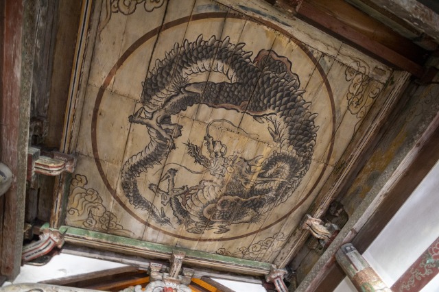 さらに奥の間の天井には、江戸時代を代表する狩野派の一人、狩野山楽(かのうさんらく)の筆と伝えられる龍図が描かれています。特別公開時以外は入ることができませんが、衝立の外からでも少しかがんで上を覗くと、その迫力ある龍の姿を見ることができます。