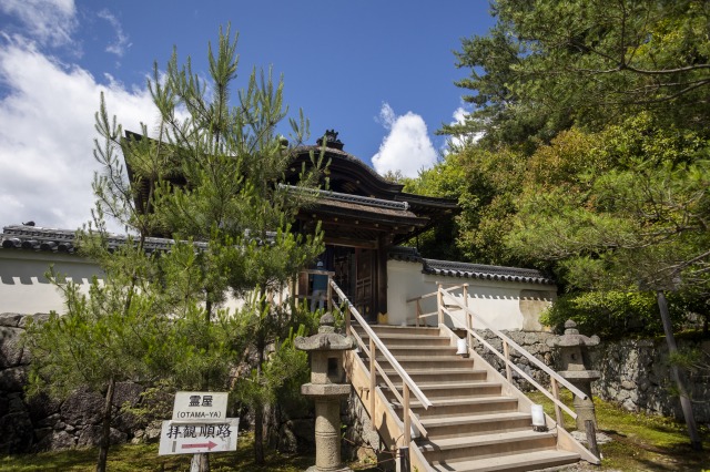 高台寺の中央部にある開山堂(かいざんどう)は、伏見城からの遺構であり、創建当時から残る非常に古い建物。楼船廊(おうせんろう)という唐破風(からはふ)屋根付きの廊下で方丈と結ばれ、その中ほどに秀吉が愛した観月台があります。ここでねねが秀吉を偲びながら月を眺めたといわれていわれています。