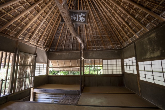 傘亭は内部に竹が放射線状に配されており、広げた傘を見上げるような屋根裏の造りからこの名に。伏見城の頃は池に面した水辺に建っていたと推測され、入口は舟で出入りできるよう跳ね上がり式の「舟入り口」という構造です。