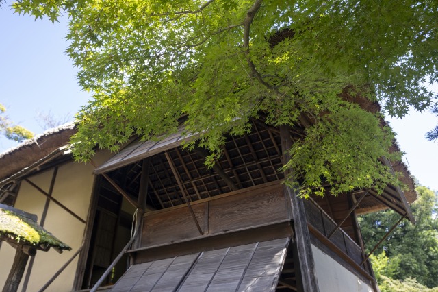 一方、時雨亭は2階建てになった杉皮葺切妻屋根の茶室。1階は「お待ち合い」で、茶会は2階の茶席で営まれていました。庇の向こうには京都の南向きの眺望が広がり、霊山観音、その向こうにはなんと大阪の「あべのハルカス」周辺のビル群がくっきりと望めます。慶長20年(1615)の「大坂夏の陣」でも、ねねは大坂城が炎に包まれているのをこの時雨亭から眺めていたと伝えられています。