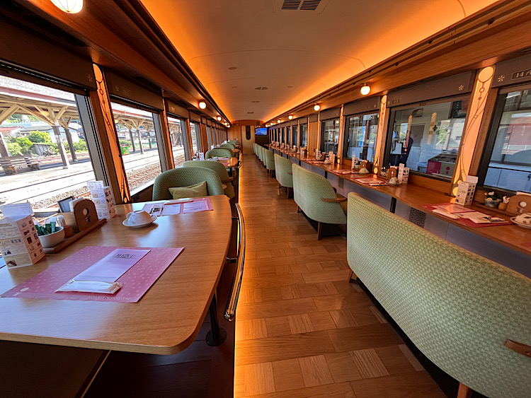 1号車茜(あかね)の章(写真上)は、夕焼けを思わせる茜色の車両です。4名まで座れるボックス席などさまざまなシートタイプがあって、運転席側は大きなガラス扉になっているので、前面の眺望も楽しめるのがポイント。3号車陽華(はるか)の章は、なんと贅沢にも定員8名の個室空間。家族や友人同士など気兼ねなく過ごすことができるので、お祝いごとや記念日などに利用するのもおすすめです。