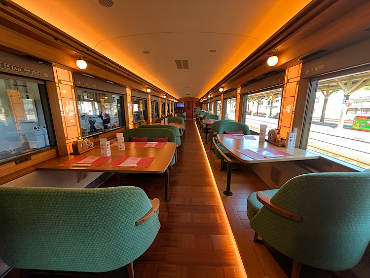 レトロモダンな車内に乗車! 2号車の黄金(こがね)の章は、愛媛の名産品のみずみずしい柑橘がイメージされ、すっきり明るい印象の車内になっています。ペアシートが窓向きに配置されているほか、向かい合わせの席も1段高くなっているので、左右どちらの車窓も楽に見渡すことができ、空間が広々していることにびっくり。リラックスして旅を楽しめそう。