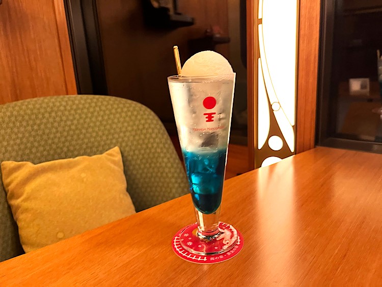 車内でオーダーできる「懐かしのくりーむそーだ」も色がキレイでおすすめです。車内ではほかにも、みかんジュースや道後ビールなどご当地ならではの魅力的なドリンクも豊富に揃っていて、選ぶのも楽しくなります。