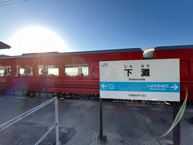 車窓に美しい伊予灘が広がってきたら、映画やドラマのロケ地としても有名な無人駅、下灘駅に到着です。下車すると、夕日を待つ観光客と思われる人たちがたくさんスタンバイしていました。ここでは10分ほど下車できます。この日はお天気もよかったので伊予灘が格別に美しく、「伊予灘ものがたり」の車体とのコントラストがきれいでした。日没時間は季節によって変わりますが、どの時間帯に訪れてもその時々で美しい景色を見せてくれる駅です。
