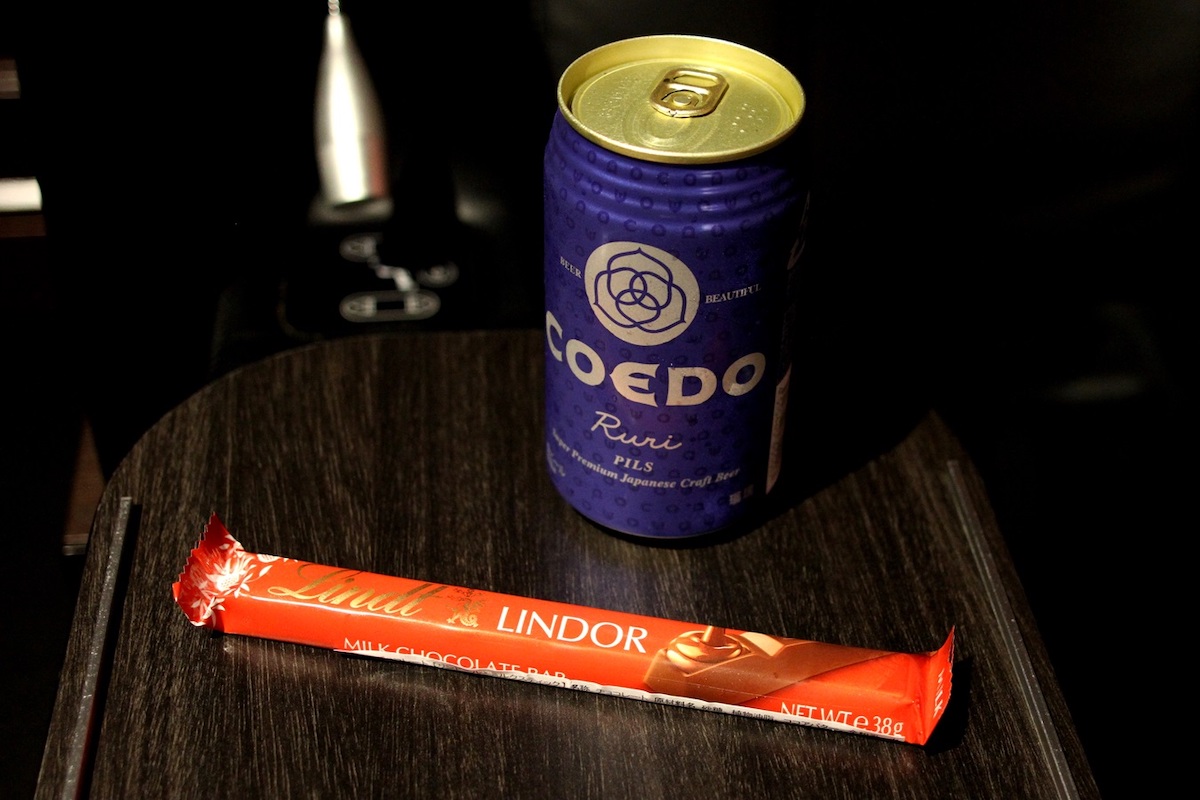 「グランシアター」利用者にはウェルカムドリンクとスイーツも。ドリンクはコーヒーやフレーバージュースのほか、「COEDO BREWERY」のクラフトビール、ワインなどのアルコールメニューも選べます。スイーツは、リンドールのチョコバー、ゴディバのアイス(バニラ、ストロベリー、チョコ)、ミックスナッツがラインナップ。