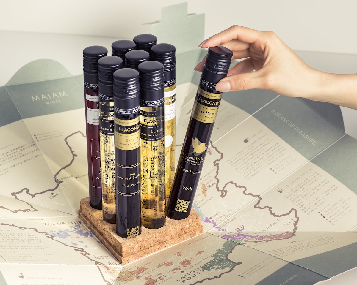 「人生を豊かにするグラス1杯のワイン」というコンセプトどおり、「MAIAM WINES」で購入できるワインはどれも100ml。飲み切りサイズだから余ってしまうという心配やプレッシャーもなく、さまざまな種類のワインを試しやすいのが◎。ワインは試験管のようなかわいいケースに入っていて、フルボトルと同じデザインが施されています。大きさによっては重く注ぎづらいイメージのフルボトルに対して、ワンハンドでも持ちやすい細長い形状のため腕に負担かけることなくワインを楽しめるのはおひとりさまにはうれしい!