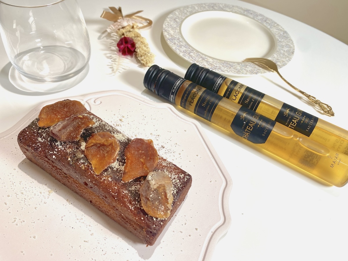 ペアリングコースは常時3種類揃えており、「季節のデザート×デザートワイン」8000円はその名の通り季節の食材をつかったデザートと甘口ワインのコース。組み合わせは3ヶ月に1度入れ替わり、取材時はデザートが「ロックフォールとドライ柿のパウンドケーキ」、ワインが「ソーテルヌ シャトー・ギロー」でした。
