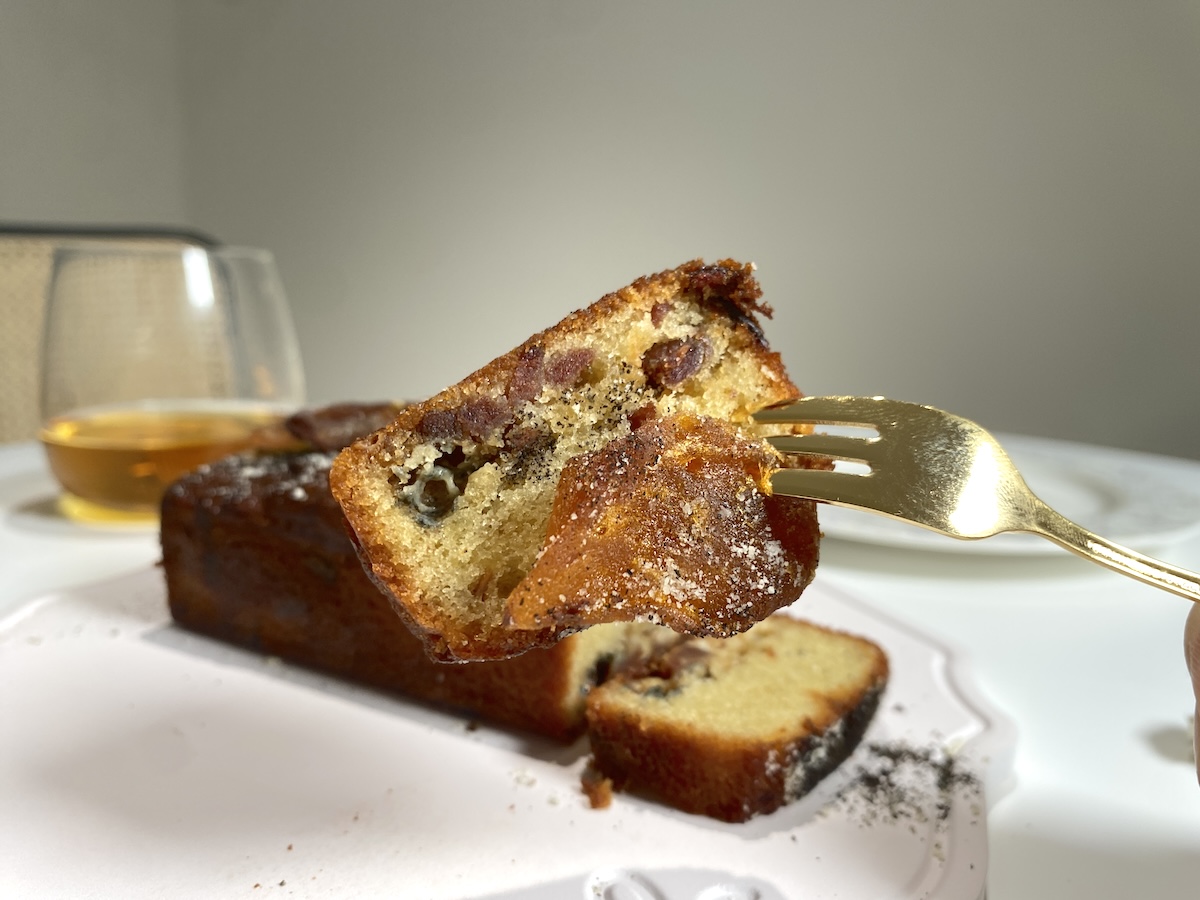 「ロックフォールとドライ柿のパウンドケーキ」は世界3大ブルーチーズの1つであるロックフォールを使ったパウンドケーキ。ひと口食べてみると、ギュッと閉じ込められたブルーチーズの香りと酸味が徐々に広がっていき、ワインを飲みたいという欲が見事にそそられます。