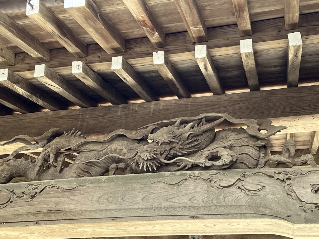 御本殿入口の龍の彫刻は江戸時代のもの。松崎町出身の名工・石田半兵衛(邦秀)の作品と伝えられています。