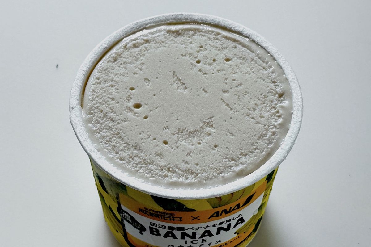 蓋をあけると、バナナの果肉そのものといった感じの、自然な色のアイスが詰まっています。このアイスには、ANAフーズのオリジナルブランド、田辺農園のバナナで製造するバナナピューレが使用されています。