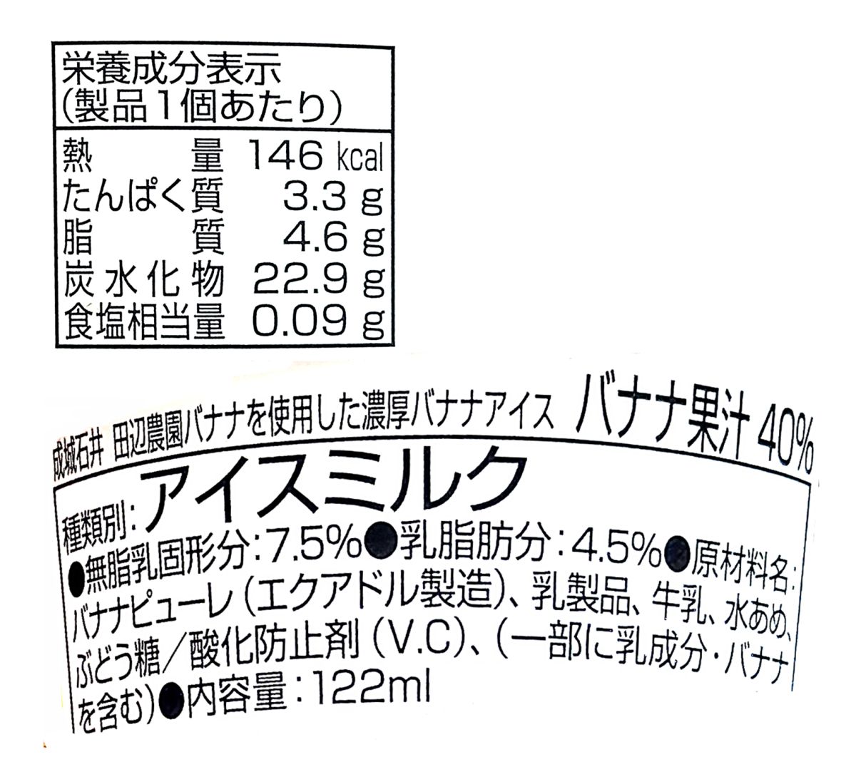 成分表はとてもシンプル。バナナ果汁(ピューレ)が40%も使用されていて、アイスとして余計なものは入っていないという印象です。