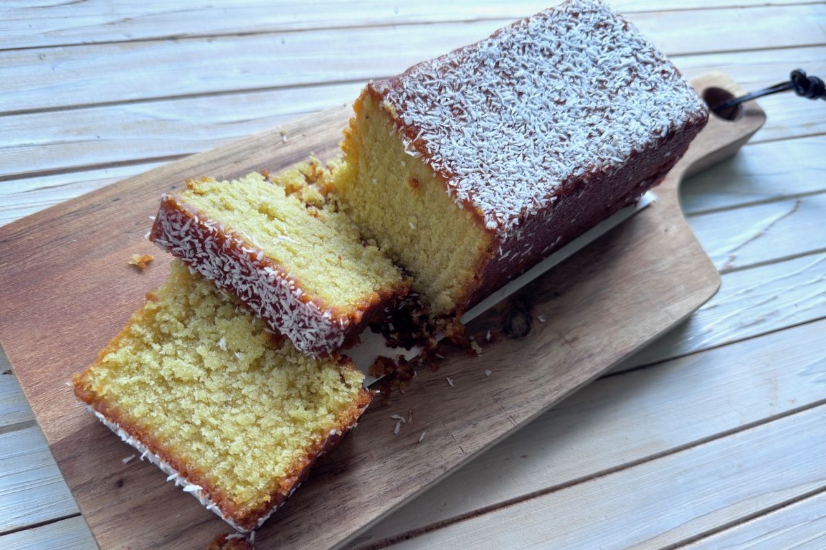 まずはケーキ単体を味わいます。口当たりはしっとりしていて、バナナの風味が口いっぱいに広がります。パウンドケーキの上には、ラム酒とパッションフルーツのシロップがぬられ、ココナッツファイン(果肉を細かく削ったもの)がふりかけられています。