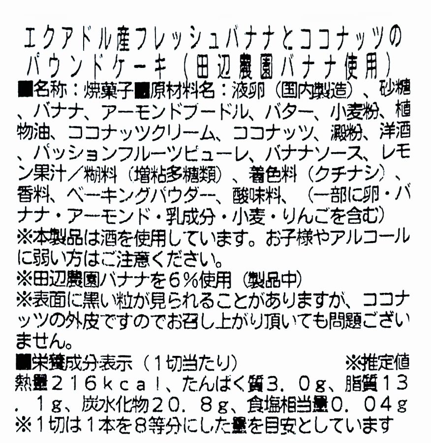 パウンドケーキは、バナナ、レモン果汁、ラム酒を入れて作られたバナナジャムとココナッツクリームを混ぜ合わせた生地で、焼き上げられています、製品中、田辺農園バナナは6%使用。気になるカロリーは、1切れあたり(1本を8等分した場合)216kcalです。